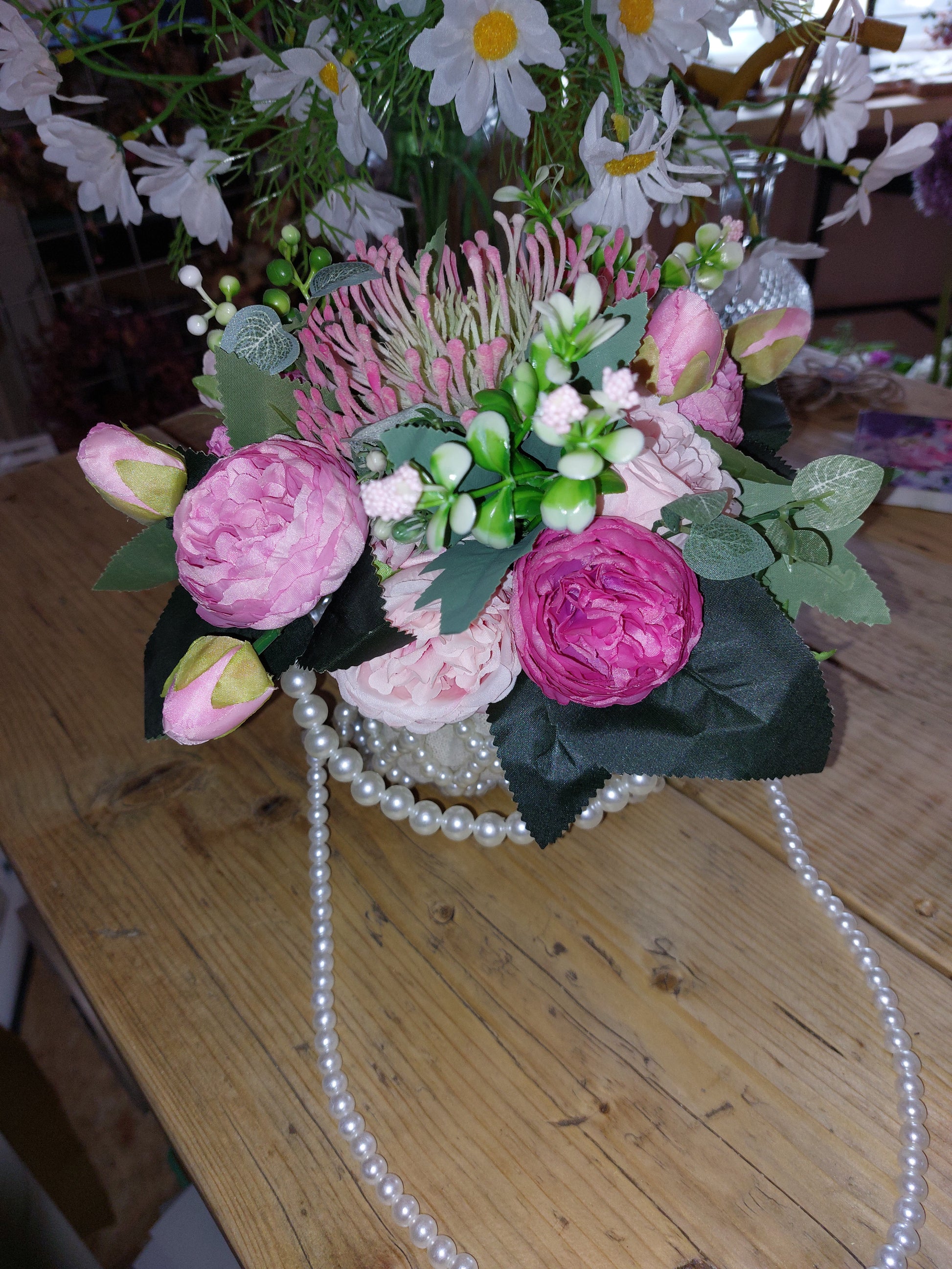 This alternative wedding bouquet features a beautiful assortment of artificial flowers including peony, spider chrysanthemum, and beaded accents. The bouquet comes with a convenient bag to carry it across the body, making it a practical yet elegant choice for any bride. Say "I do" with style and ease.