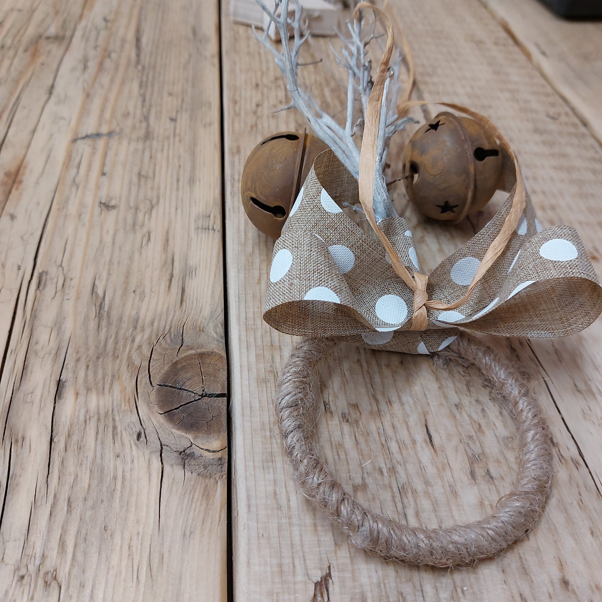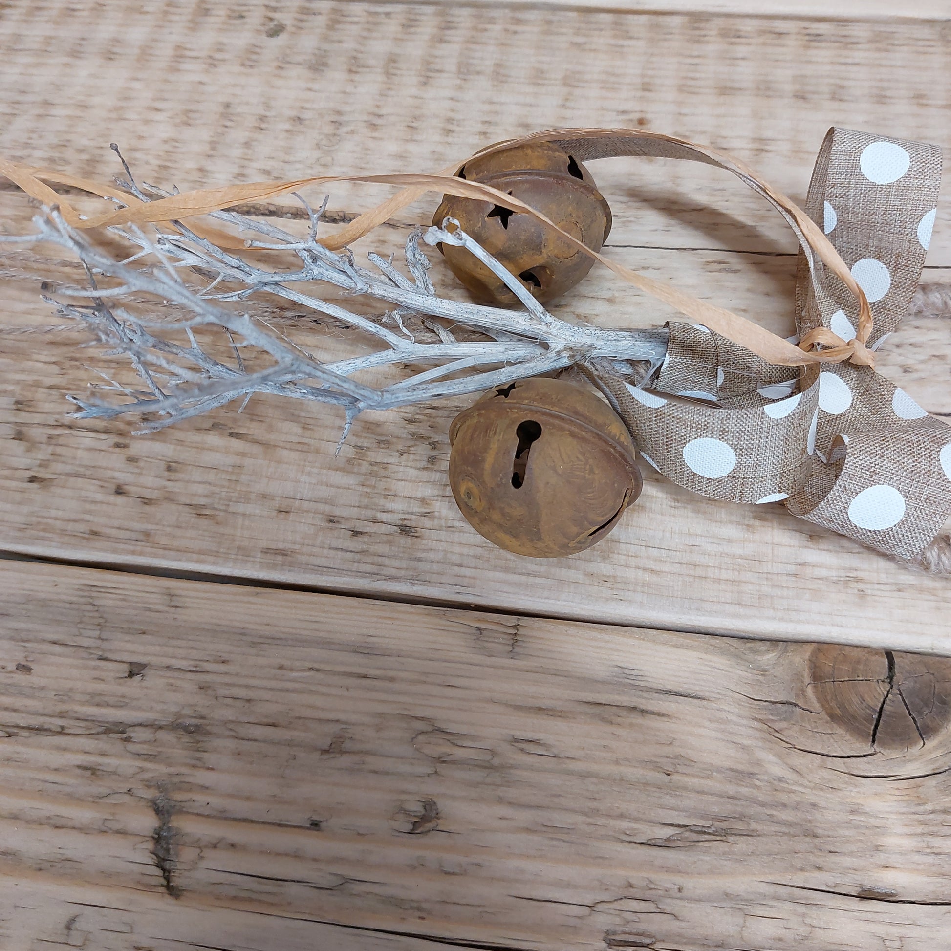 Handcrafted with care, this rustic door hanger features charming stars, bells, sticks, and a spotty bow. Its hand-tied string hoop adds a touch of elegance to any door. Enjoy a unique and stylish addition to your home decor.